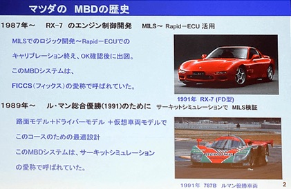 ・1989 年: MILS の初期の成功事例は、1991 年ル・マン 24 時間レースにおける総合優勝車両の開発である。我々はル・マンの路面モデル を作り、この仮想コース上で、規定の燃料量内で一番早く 走るためのエンジン~車両の設計を行った。この MBD ツールはサーキットシミュレーションと呼ばれた。